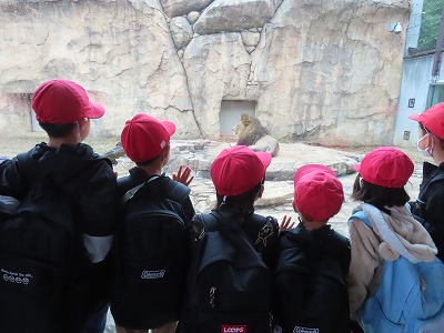その後、2年生がリーダーとなり、1年生とグループを組んで園内を見学して回りました。間近にライオンやキリン等の動物が現れると「大きい!!」等の歓声があがっていました。
