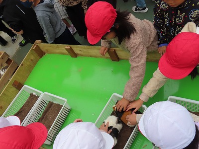 動物公園では、最初にテンジクネズミとウサギとのふれあいを行いました。実際に触れることで、手の平から動物の体温や息づかいが伝わり、「命」を感じることができました。