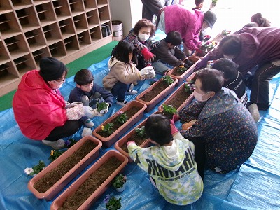 1年生一人ずつにプランターとパンジーの苗を3ついただき、植え方を教えてもらいながら楽しい一時を過ごすことができました。