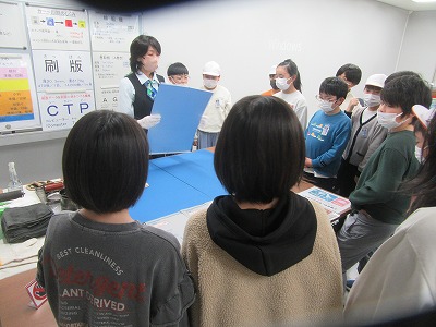 工場は野球場くらいの敷地面積にもかかわらず、パノラマ印刷が可能な輪転機を配備し、新聞2紙や様々な情報誌を扱っている工場だそうです。新聞は朝刊・夕刊・地方紙の印刷が毎日行われていることにも驚きですが、印刷の他に製本、仕分け、パッキングを2 0人が3交代制で24時間稼働していることで、各家庭に新聞が届く仕組みを学んできました。