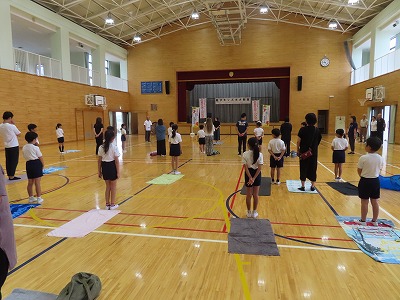 10月6日(月)のさかスポーツクラブ主催「親子キッズヨガ教室」が3年生児童18名と保護者14名の参加で行われました。
