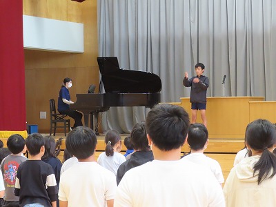 6年生の指揮者に合わせて全校で校歌を歌い、後期の開始に向け、「読書の秋」「スポーツの秋」「友達となかよく」という3つの話を聞きました。