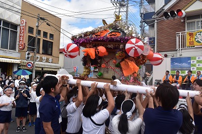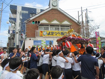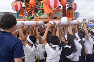 栄小学校は、ハロウィンの飾り付けがされた華やかな神輿で参加しました。担ぎ手は4・5・6年生、川辺お囃子連盟と野栄太鼓の方々の協力もあり、大きな掛け声で盛り上がりました。