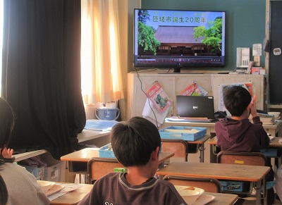 12月5日(金)、訪日教育旅行学校交流事業として台湾桃園市の社子國民小學から、児童9名、校長先生他職員3名の来校があり、歓迎式では全校の児童と職員が参加しました。式では互いの記念品の交換や学校紹介が行われ、生の中国語や台湾の文化について興味深げに聞き入っていました。その後、5・6年生は工作交流と給食交流を行い、昼休みには運動場で遊びました。