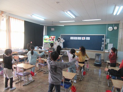 普段は野栄中学校で外国語指導助手をしている先生が来校し、英語で色や動物の単語を使ったゲームをしました。先生の発音に習って元気よく「White!」「Lion!」と返し、楽しく学べました。